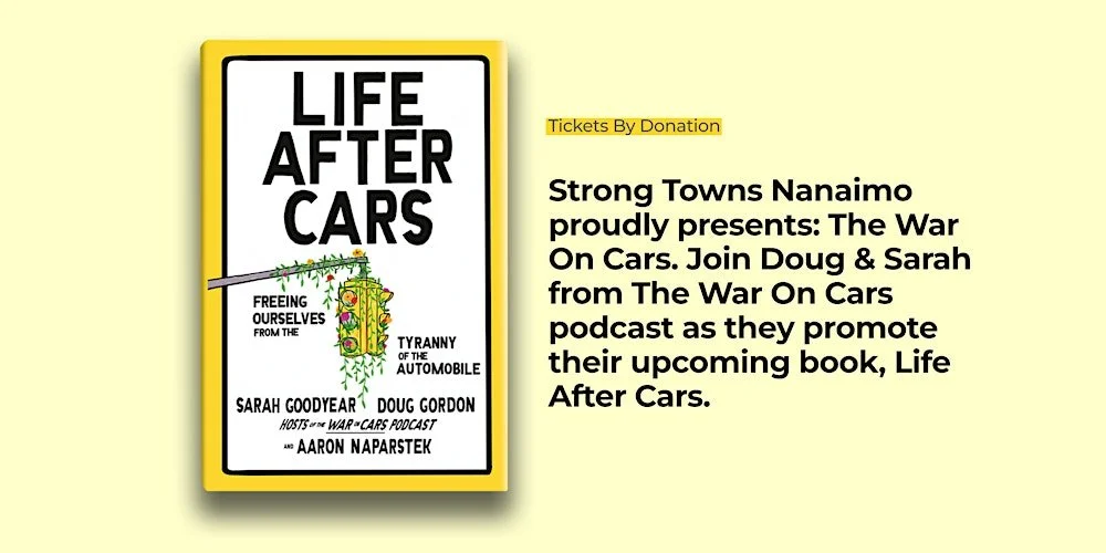 Strong Towns Nanaimo is proud to host Doug and Sarah from The War On Cars as they tour the continent to celebrate the release of their new book: Life After Cars! Come learn about the beauty of a life without an automobile! Join your two favourite authors & podcasters for a moderated roundtable discussion on transportation, sustainability, and mobility in the urban context.