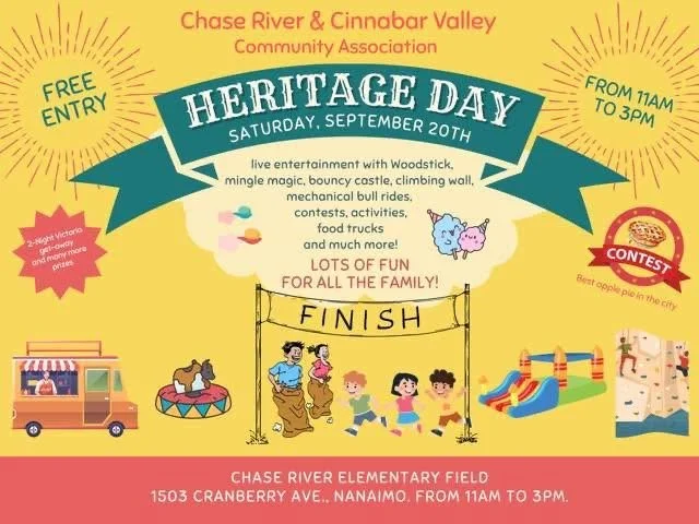 529 Registration at CRCA Heritage Day Saturday, September 20, 2025 11:00 a.m. 3:00 p.m. Chase River Elementary School 1503 Cranberry Avenue Nanaimo, BC, V9R 6R7 Canada (map) Google Calendar ICS This event is at Chase River Elementary. The Chase River & Cinnabar Valley Community Association Heritage Day is a free-entry family event with music, entertainment, food trucks and various displays for all ages. The Nanaimo Area Cycling Coalition will be at the event for 529 Registration.